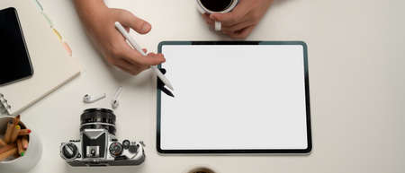 Overhead shot of male hand using mock up tablet on office desk with camera and stationery