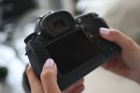 Female hands are holding a camera in photo studio close-up. Repair services for camera technology concept.