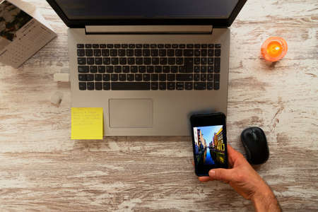 Social media communication. POV . Unrecognizable male taking picture in selective focus, modern technology concept