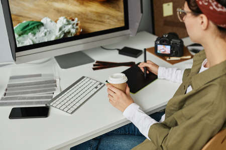 Cropped shot of young female photographer editing pictures at workplace in studio using pen tablet