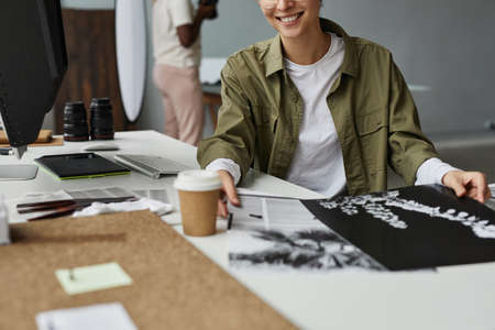 Cropped shot of female photographer looking at photo prints while working in studio, copy space