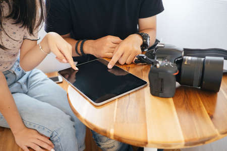 Cropped view of the hands of a male photographer co-working with his mixed race female colleague at the office while having some breakfast