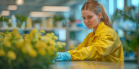 A janitor in a yellow uniform is mopping the floor of a beautifully designed corridor lined with vibrant green plants. The early morning light filters through the space, enhancing the atmosphere.