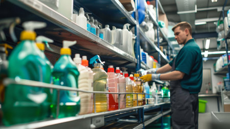 Focused employee organizing various chemical bottles in the storage section of a dry cleaning facility.