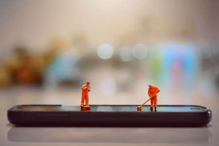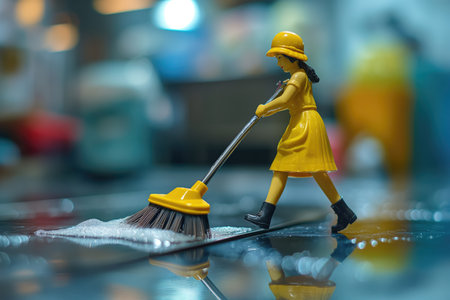 Three tiny figurines dressed as workers are sweeping up crumbs from a flat surface. The scene captures their teamwork and dedication in a fun and imaginative way, highlighting their vibrant colors.