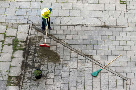 Detailed close-up of a street cleaner sweeping a street in a small town. Janitor, paved street, collecting dirt and leaves.