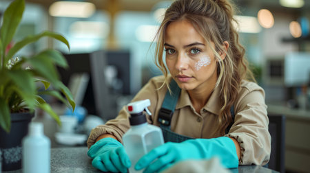 A woman in a beige shirt and blue gloves is sitting at a desk with a plant, holding a bottle of lotion