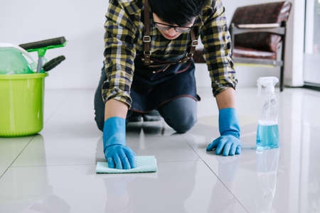 Husband housekeeping and cleaning concept, Happy young man in blue rubber gloves wiping dust using a spray and a duster while cleaning on floor at home.