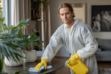 Cleaning worker tidies up a modern living room while wearing protective gear and focusing on detail