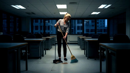 A worker in a yellow shirt and blue helmet mops the floor of a contemporary office at night.