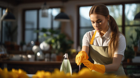 Housewife is using antiseptic spray for wiping table. Washing surfaces with towel and gloves.