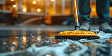Closeup of janitors hand mopping office floor cleaning for professional workspaces. Concept Janitorial Services, Office Cleaning, Professional Workspaces, Janitorial Supplies, Cleaning Equipment