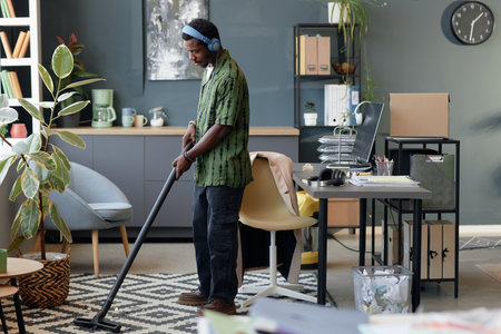 Side view full length portrait of young African American man vacuuming carpet and listening to music while cleaning floors in office, copy space