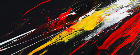Streaks of red, yellow, and white on a deep black background, forming a highcontrast, abstract composition