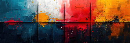 Vertical composition showcasing a fragmented and energetic abstract design. The combination of bright color blocks and raw, rough paint textures creates a unique and appealing surface. Use this image as a versatile background template for posters, advertisements, or projects related to art, innovation, and design thinking.