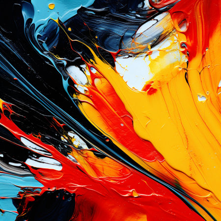 Vibrant abstract paint strokes in a rich color palette of red, yellow, and blue, showcasing an artistic burst of creativity and energy