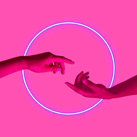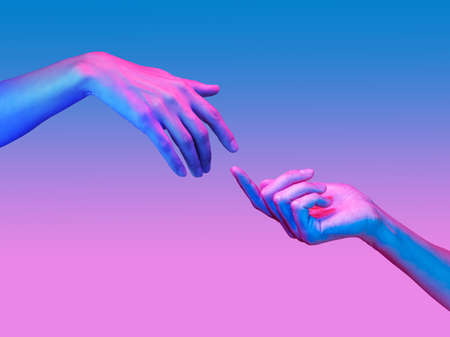 Two hands reach out to each other with pink violet neon light. Minimalism fashion. Surrealism. Concept art
