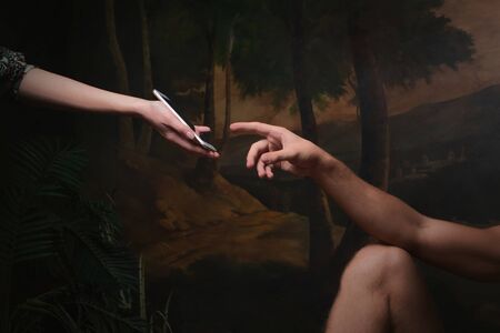 Smartphone screen touch, fingerprint recognition, concept. A funny remake of the creation of Adam, technology and modernity in the style of Renaissance paintings