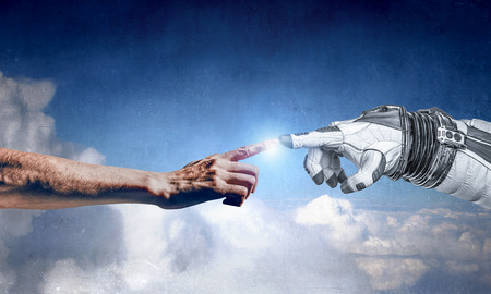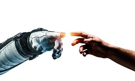 Man's hand reaches for a robot hand on a light background. Android robot helps a human. technology concept