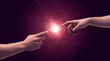 White caucasian male hands reaching out with fingers almost touching in bright red light sparkle in empty space background concept