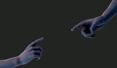 hands interacting to touch each other in adam's creation style with neon lighting. 3d rendering