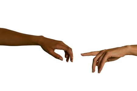 Close up of two arms, of a young Caucasian and a young mixed race woman, with hands reaching out towards each other, one pointing