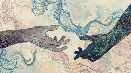 Artistic Illustration of Two Hands Reaching Out Surrounded by Flowing Patterns Concept of Connection, Unity, Harmony, and Creativity.