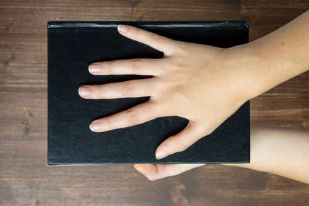 the hand of an adult man lies on the bible as a sign that he is telling the truth