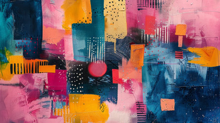 A textured abstract background with layers of mixed media, incorporating elements like digital brushstrokes and scattered shapes for a creative look.