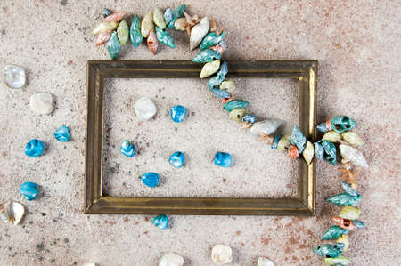 Antique brass empty picture frame and seashells on concrete background. Photography props and copy space for text.