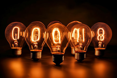 Five light bulbs are lit up and arranged in a row. The bulbs are all different sizes and shapes, but they all have a warm, glowing light. Concept of warmth and comfort