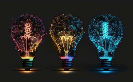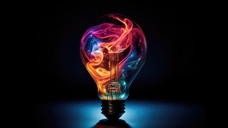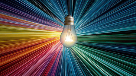 Vibrant light bulb illuminates spectrum of colors radiating outward, creating dynamic and energetic visual effect. interplay of light and color evokes sense of creativity and inspiration