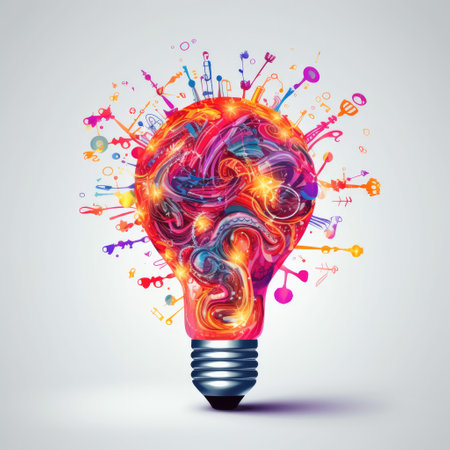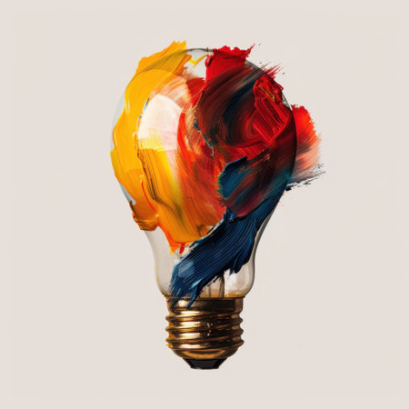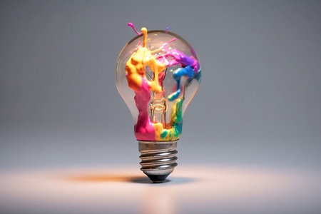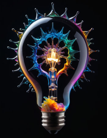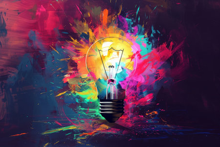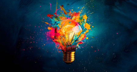 A lightbulb explodes with vibrant colors, symbolizing creative energy.