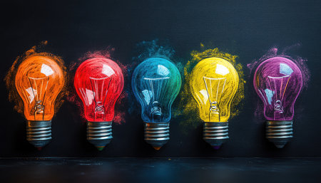 An array of colorful light bulbs lit against a vibrant, textured artistic background, symbolizing creativity and ideas.