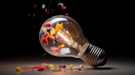 Enlightening creativity: a bright explosion of colorful powder coming from a light bulb, symbolizing innovation and ideas