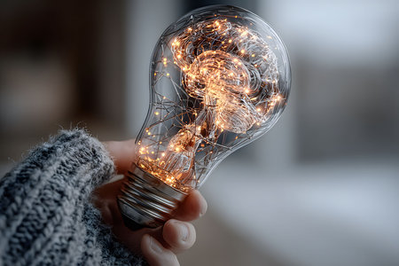 A close-up image of a hand holding a light bulb with intricate, glowing wires forming the shape of a human brain. this concept represents innovation, creative thinking, and the fusion of ideas, perfect for designs focused on inspiration and intellect. Generative AI