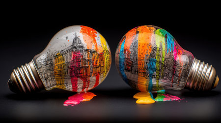 Two light bulbs feature intricate cityscape drawings and vibrant paint drips, creating a modern artistic statement against a dark background.