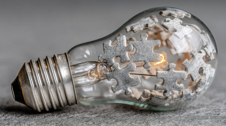 This unique light bulb design features intricate puzzle pieces, symbolizing creativity and innovation. It captures the essence of problem-solving through elegant illumination.