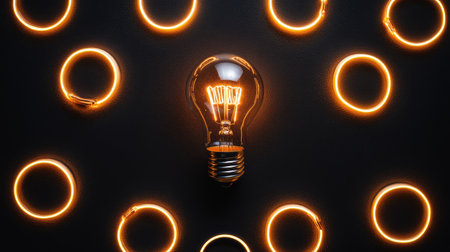 A captivating light bulb at the center, surrounded by vibrant glowing rings, set against a dark backdrop, perfect for modern and artistic design needs.
