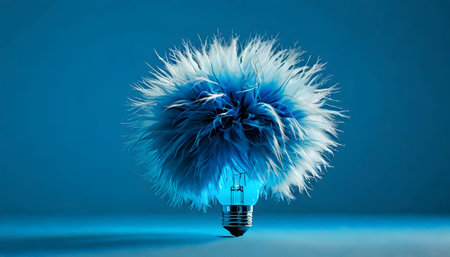 The bloom of a blue dandelion light bulb stands against a blue backdrop, merging natures beauty with technological innovation. Its glow suggests a blossoming idea. AI generation AI generation