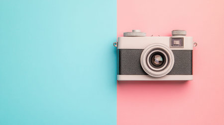 Vintage film camera on a geometric pastel background, flat lay top view evoking retro photography, nostalgia and creative hobbies with minimalist, colorful composition