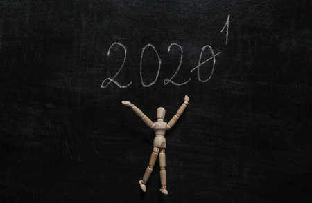 New year's transition from 2020 to 2021 on chalk board and wooden puppet