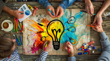 A creative workshop setting with a large sketchpad, where team members collectively draw and add to the depiction of a lightbulb, each line and color representing individual input towards a unified vision.