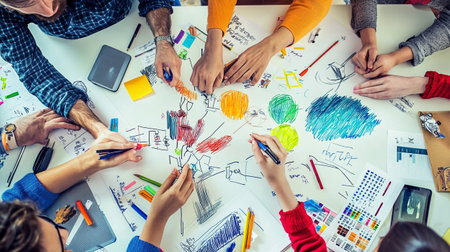 Enthusiastic teamwork is depicted as diverse hands unite over a detailed brainstorming sheet filled with colorful notes, illustrating a dynamic marketing project planning session.