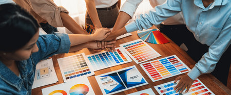 group of colleagues young business hand join together for successful business meeting with color sample chart on desk in meeting room at office, interior design, architect, graphic designer concept
