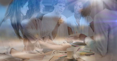 Composition of brainstorming businesswomen and glowing light trails. global business, teamwork and communication networking concept digitally generated image.