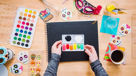 Step by step. Flat lay. Baker getting ready to sketch a design of a cake for Dia de los Muertos holiday.
