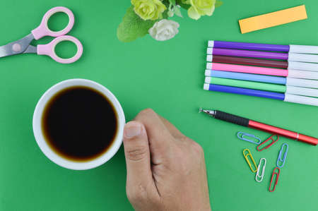 Hand holding a cup of coffee surrounded with stationery tools over green background.