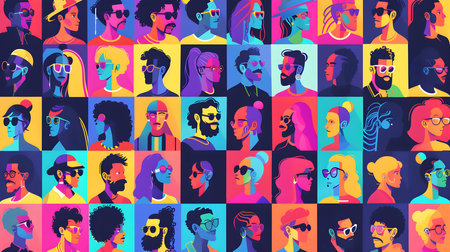 Diverse group of individuals showcasing various emotions, styles, and backgrounds in a neutral toned gallery setting, emphasizing identity and inclusivity