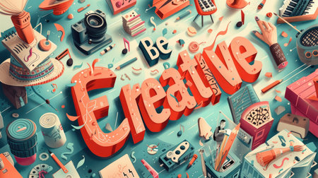 The letter of be creative in variant texture with bright light colorful color with making or constructing with musical element and art equipment with 3D design. Recreation concept. Lettering. AIG42.
